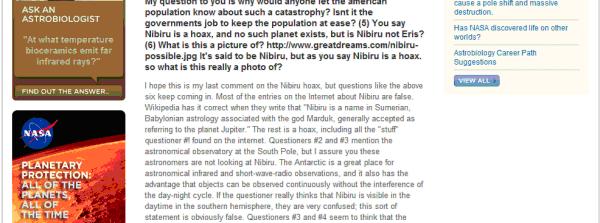وربما يتساءل البعض لماذا لا تفند ناسا او المراصد الفلكية الاخرى تلك الادعاءات الخاصة بكوكب نيبيرو؟ وهذا سؤال وجيه ولكن يجب علينا ان نتذكر ان العلماء لن يضيعوا وقتهم لتفنيد كل اشاعة جديدة تظهر على الانترنت! وبالرغم من ذلك ، فقد قامت ناسا ، وتحديدا قسم حياة الفضاء الخارجي (Astrobiology) بالرد على هذه الاشاعة نظرا لكم الأسئلة الهائلة التي تصلهم بشأن تلك الخدعة. وفيما يلي الرد من موقع ناسا الرسمي على هذا الادعاء: